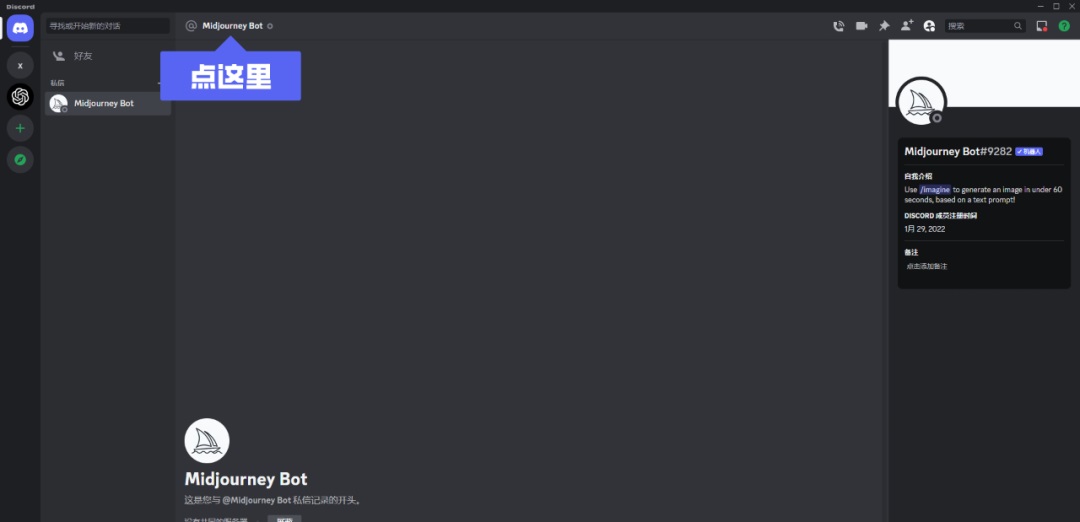 ① 打开软件进行登录,在默认对话页面,点击顶部的”寻找或开始新的对话”输入框,搜索”Midjourney Bot”