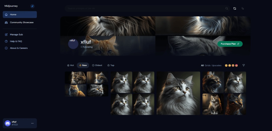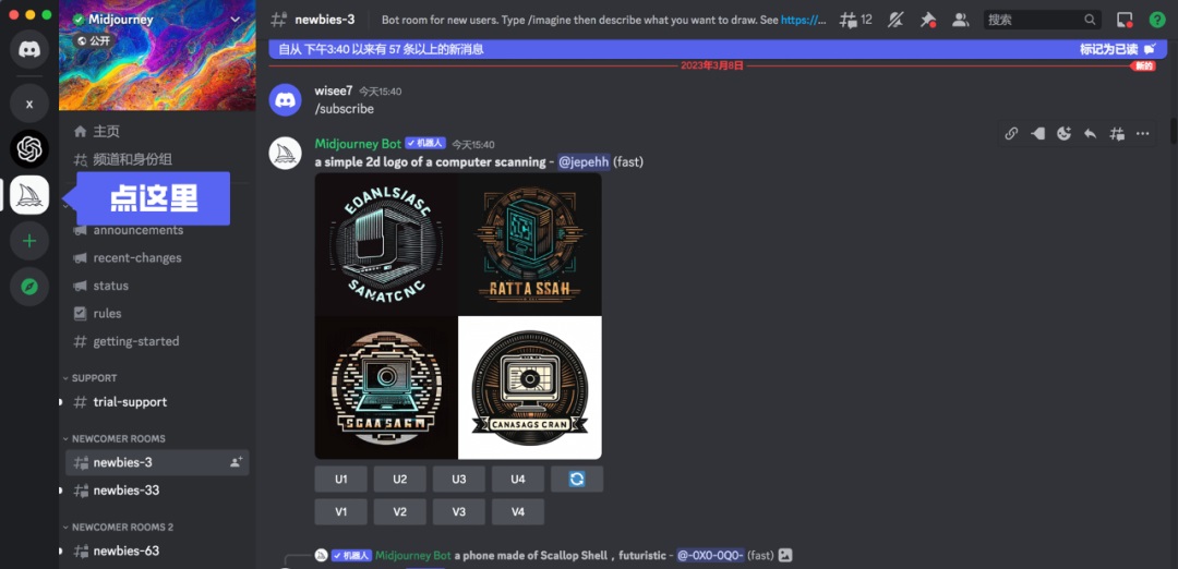 常用指令为”/imagine”,在对话框中输入此指令加空格,在 prompt 后输入关键词(如:a cat)点击回车,系统就会生成对应的插画