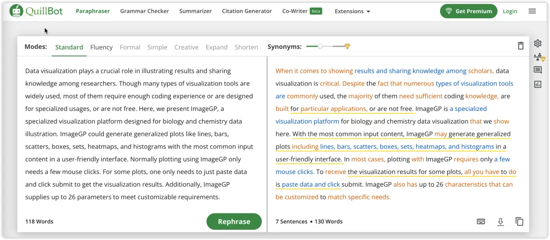QuillBot Premium是一个转述工具,它使用机器学习来重写和重组选定的文本。它的功能就像一个完整的句子辞典:用户只需右击一个句子,点击 "启动QuillBot",就可以对该句子进行改写。然后,用户可以在侧板上编辑输出,并将其放入他们的文件中。QuillBot高级版可以帮助你减少一半以上的写作时间。由于高级版本比免费版增加了字符限制(一次最多10,000个字符--3页),增加了两种写作模式(建议性和简洁性),并可使用翻字器的最高设置,你将节省时间并立即改善你的写作。
